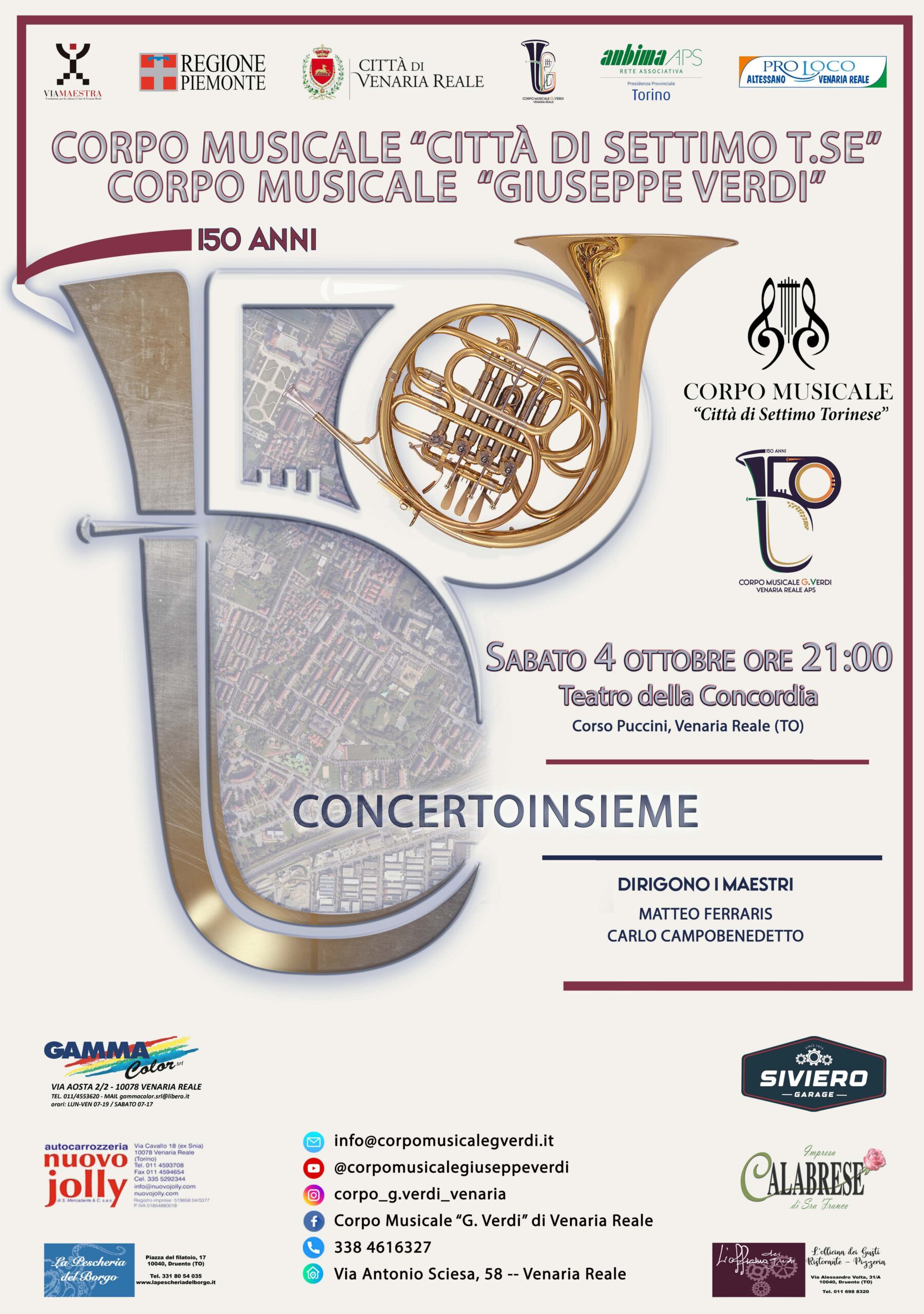 « Tutti gli Eventi Questo evento è passato. Concertoinsieme 2025 a Venaria Reale 4 Ottobre h 21:00 « Celebrazione Corpi Santi 2025 95° Anniversario di fondazione gruppo Alpini di Settimo Torinese » Il Corpo Musicale “Città di Settimo Torinese” è lieto di invitarvi al Concertoinsieme con il Corpo Musicale “Giuseppe Verdi” di Venaria Reale. Un’occasione per passare una serata in compagnia della musica con un unico organico composto da 90 musicisti. Vi aspettiamo numerosi! Scarica la locandina + Google Calendar+ Esporta in iCal Dettagli Data: 4 Ottobre Ora: 21:00 Categoria Evento: Appuntamenti Tag Evento:2025, Concerto, Concertoinsieme Luogo Teatro Concordia Corso Puccini Venaria Reale, 10078 Italia + Google Maps